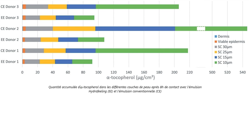 Cette étude, parue dans un journal scientifique, a mis en évidence la polyvalence du processus Hydrofeeling® dans la création d'émulsions adaptées aux industries cosmétiques et dermatologiques, répondant ainsi à la demande croissante de formulations plus sûres, efficaces et respectueuses de l'environnement. En effet il a été prouvé que les émulsions obtenues avec Hydrofeeling® préservaient davantage l'intégrité de la barrière cutanée et évitaient les effets potentiellement nuisibles des tensioactifs sur la peau et l'environnement. De plus, avec Hydrofeeling® par rapport aux émulsions conventionnelles, les actifs présents dans les émulsions se retrouvent présents en quantité homogène dans les différentes couches de la peau, éliminant ainsi la sensibilité inter-individuelle.
