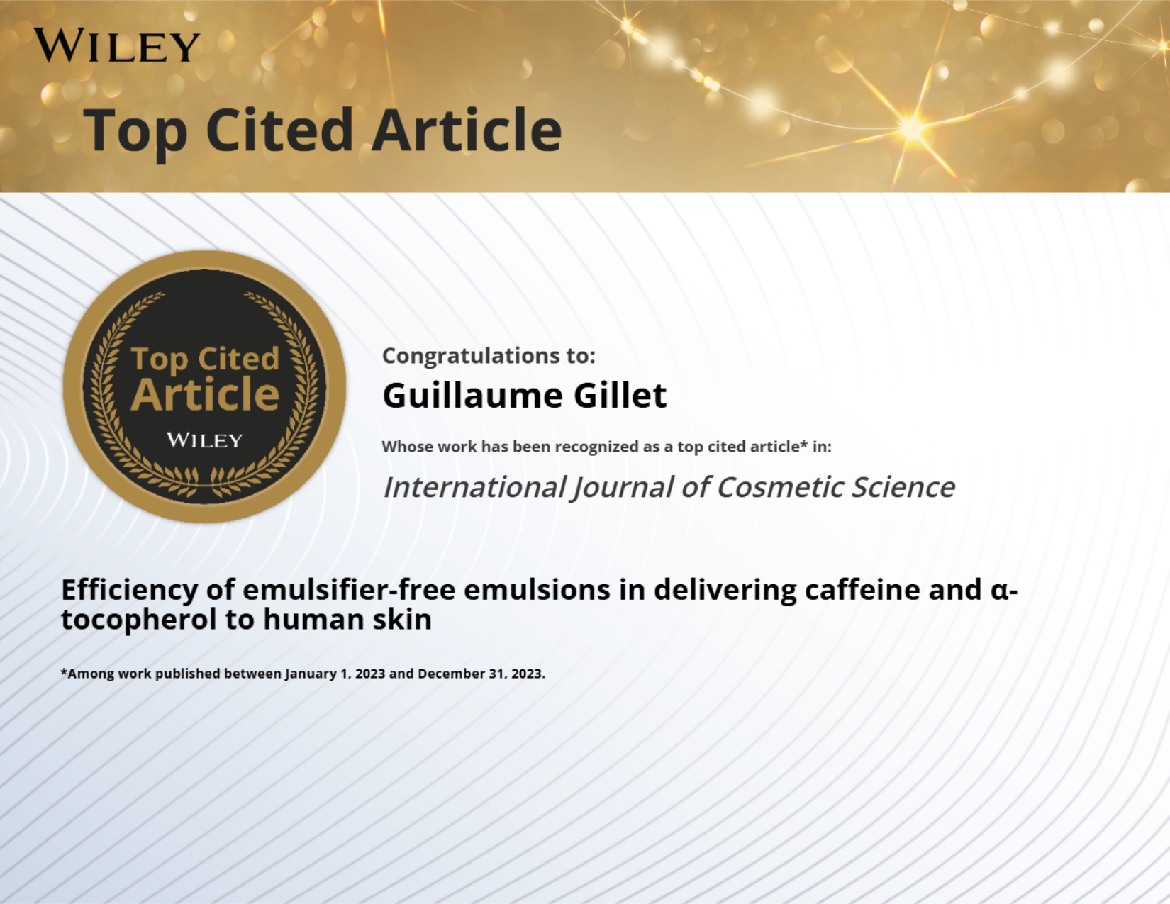 Nous sommes fiers de vous annoncer que notre article, « Efficacité des émulsions sans émulsifiant pour l'apport de caféine et d'α-tocophérol dans la peau humaine », a été reconnu comme l'un des 10 articles les plus cités de 2023 dans l'International Journal of Cosmetic Science. Un bel exemple de collaboration public/privé réussie, mettant en lumière les savoir-faire du laboratoire et de l'entreprise.