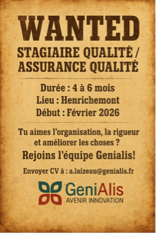 Envoyez votre CV et une lettre de motivation à a.laizeau@genialis.fr avec la référence Stage Qualité 2026.